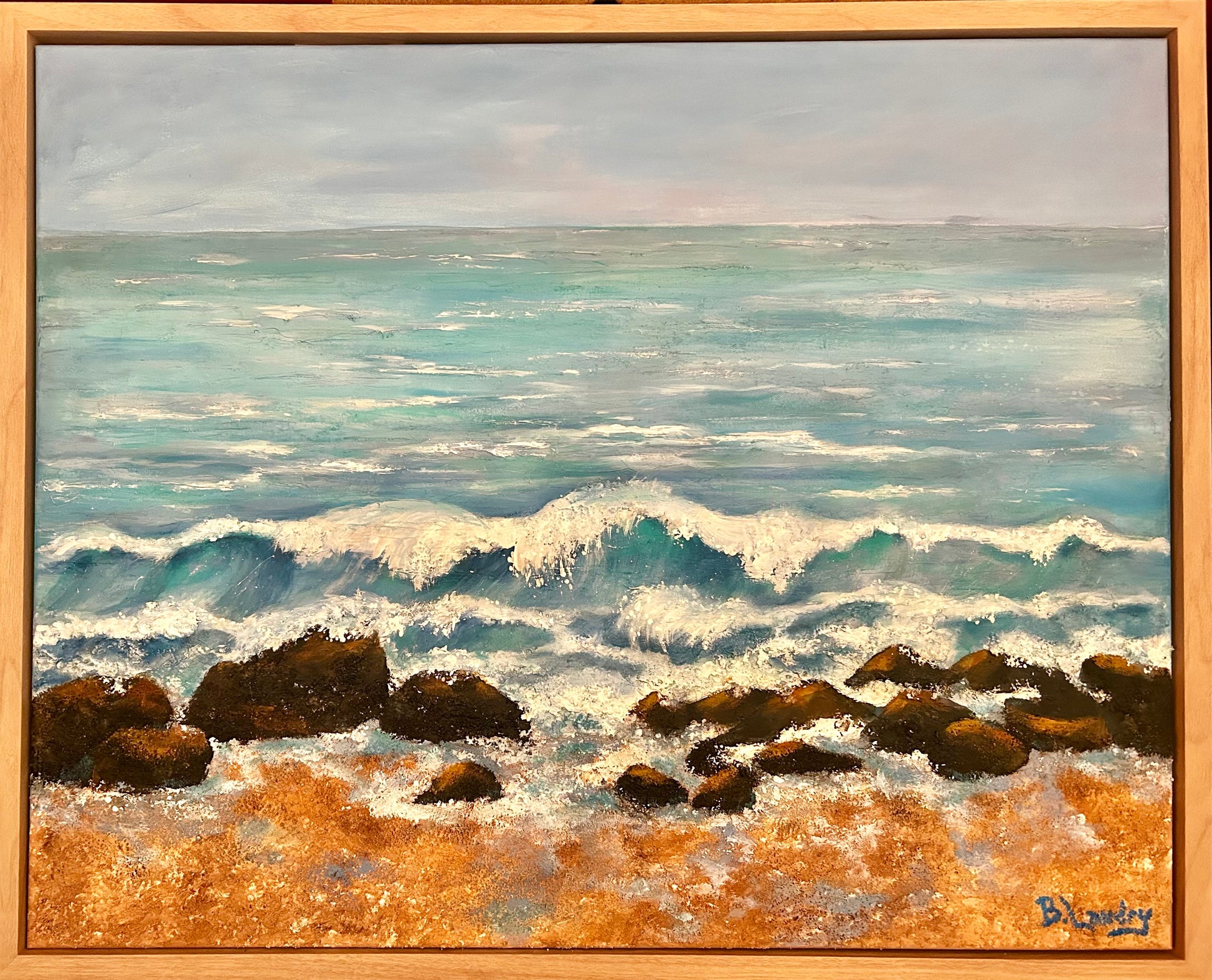 Tidal Rhythm is a study of the constant motion where sea meets land, using textured mediums to give the waves and rocks a physical presence. This piece is about the raw, quiet power of nature in transition. The art is sold framed in a natural wood canvas floater and measures 28" X 32".